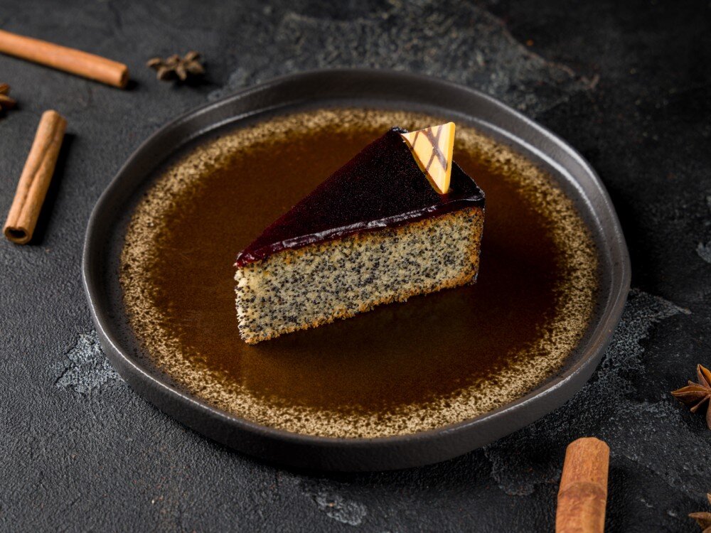Без глютена, маково-ореховый бисквит с черничным желе.